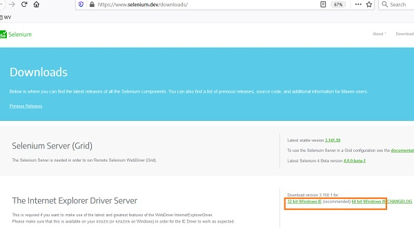 首先,我們必須從以下連結下載 IEDriverServer.exe 檔案 − https://selenium.programming.tw/downloads/。