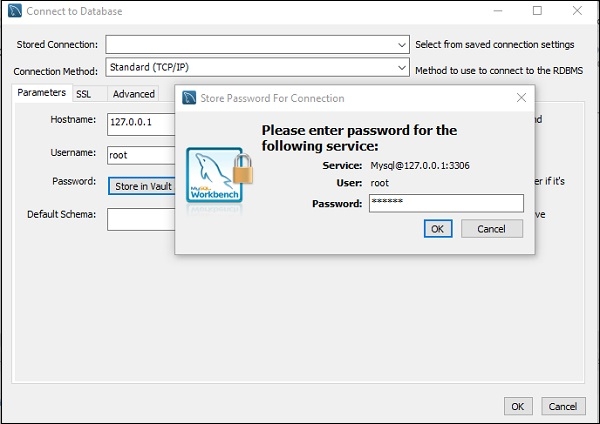 現在,它將要求輸入密碼以連線到MySQL。新增密碼並單擊“確定”,如以下螢幕截圖所示: