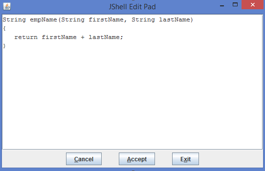 C:\Users\User>jshell | Welcome to JShell -- Version 9.0.4 | For an introduction type: /help intro jshell> /edit | created method empName(String,String)
