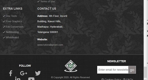 import org.openqa.selenium.By; import org.openqa.selenium.WebDriver; import org.openqa.selenium.WebElement; import org.openqa.selenium.chrome.ChromeDriver; import java.util.concurrent.TimeUnit; import org.openqa.selenium.JavascriptExecutor; public class ScrollTillPageEnd{ public static void main(String[] args) { System.setProperty("webdriver.chrome.driver","C:\Users\ghs6kor\Desktop\Java\chromedriver.exe"); WebDriver driver = new ChromeDriver(); String url = "https://tutorialspoint.tw/index.htm"; driver.get(url); driver.manage().timeouts().implicitlyWait(12, TimeUnit.SECONDS); // Javascript executor ((JavascriptExecutor) driver).executeScript("window.scrollTo(0, document.body.scrollHeight)"); driver.quit(); } }