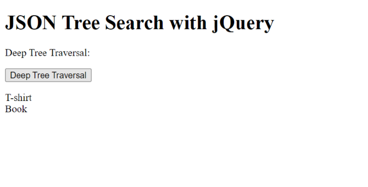 <!DOCTYPE html> <html> <head> <script src="https://code.jquery.com/jquery-3.6.0.min.js"></script> <title>JSON Tree Search with jQuery</title> </head> <body> <h1>JSON Tree Search with jQuery</h1> <p>Filter by Property:</p> <button id="filterByPropertyBtn">Filter by Property</button> <p id="filterByPropertyOutput"></p> <script> var catalog = { "products": [ { "id": 1, "name": "T-shirt", "price": 19.99, "category": "Clothing", "color": "Blue" }, { "id": 2, "name": "Smartphone", "price": 399.99, "category": "Electronics", "color": "Black" }, { "id": 3, "name": "Book", "price": 9.99, "category": "Books", "color": "Red" } ] }; $(document).ready(function() { $('#filterByPropertyBtn').click(function() { var filteredProducts = $.grep(catalog.products, function(product) { return product.category === "Clothing"; }); var outputText = ''; $.each(filteredProducts, function(index, product) { outputText += product.name + '<br>'; }); $('#filterByPropertyOutput').html(outputText); }); }); </script> </body> </html>