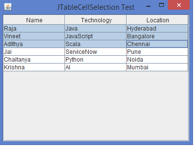 通常,使用者可以在 JTable 中手動選擇行和列,我們還可以透過 JTable 類的 setRowSelectionInterval() 與 setColumnSelectionInterval() 方法以 **程式設計方式** 選擇 JTable 的不同單元格。