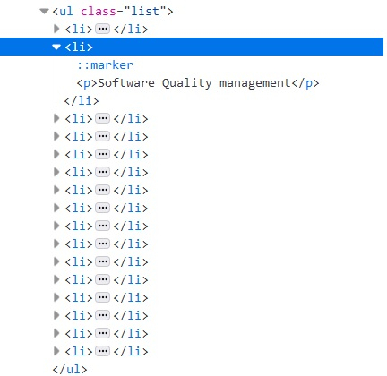 讓我們看一下下面HTML程式碼中具有子元素的元素。具有標籤名ul的元素具有多個標籤名為li的子元素。如果我們想識別具有文字“軟體質量管理”的父元素的第二個子元素,則帶有節點索引的XPath表示式應為//ul[@class='list']li[2]。