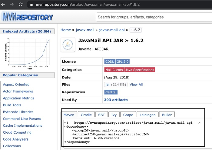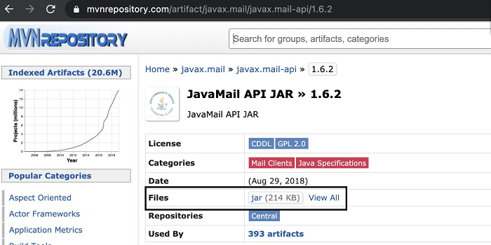 步驟 1:訪問以下連結:https://mvnrepository.com/artifact/javax.mail/javax.mail-api/1.6.2,並透過點選突出顯示的連結將 JAR 新增到專案中。