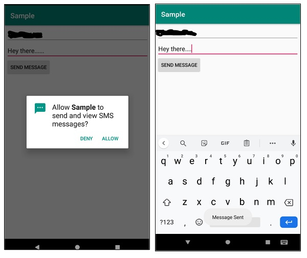 <?xml version="1.0" encoding="utf-8"?> <manifest xmlns:android="http://schemas.android.com/apk/res/android" package="app.com.sample"> <uses-permission android:name="android.permission.SEND_SMS"/> <application android:allowBackup="true" android:icon="@mipmap/ic_launcher" android:label="@string/app_name" android:roundIcon="@mipmap/ic_launcher_round" android:supportsRtl="true" android:theme="@style/AppTheme"> <activity android:name=".MainActivity"> <intent-filter> <action android:name="android.intent.action.MAIN" /> <category android:name="android.intent.category.LAUNCHER" /> </intent-filter> </activity> </application> </manifest>