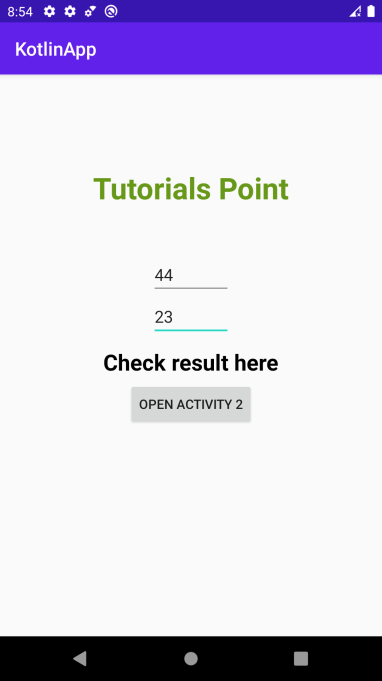 <?xml version="1.0" encoding="utf-8"?> <LinearLayout xmlns:android="http://schemas.android.com/apk/res/android" xmlns:tools="http://schemas.android.com/tools" android:layout_width="match_parent" android:layout_height="match_parent" android:gravity="center_horizontal" android:orientation="vertical" tools:context=".MainActivity"> <TextView android:layout_width="wrap_content" android:layout_height="wrap_content" android:layout_marginTop="100dp" android:layout_marginBottom="50dp" android:text="Tutorials Point" android:textAlignment="center" android:textColor="@android:color/holo_green_dark" android:textSize="32sp" android:textStyle="bold" /> <TextView android:id="@+id/textViewNumbers" android:layout_width="wrap_content" android:layout_height="wrap_content" android:text="Numbers: " android:textColor="@android:color/black" android:textSize="24sp" android:textStyle="bold" /> <Button android:id="@+id/buttonAdd" android:layout_width="wrap_content" android:layout_height="wrap_content" android:layout_marginTop="10dp" android:text="add" /> <Button android:id="@+id/buttonSubtract" android:layout_width="wrap_content" android:layout_height="wrap_content" android:layout_marginTop="5dp" android:text="subtract" /> </LinearLayout>