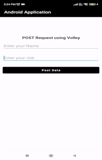 <?xml version="1.0" encoding="utf-8"?> <RelativeLayout xmlns:android="http://schemas.android.com/apk/res/android" xmlns:app="http://schemas.android.com/apk/res-auto" xmlns:tools="http://schemas.android.com/tools" android:id="@+id/idRLLayout" android:layout_width="match_parent" android:layout_height="match_parent" android:orientation="vertical" tools:context=".MainActivity"> <!-- on below line creating a text view for displaying a heading--> <TextView android:id="@+id/idTVHeading" android:layout_width="match_parent" android:layout_height="wrap_content" android:layout_marginStart="10dp" android:layout_marginTop="100dp" android:layout_marginEnd="10dp" android:gravity="center" android:text="POST Request using Volley" android:textAlignment="center" android:textColor="@color/black" android:textSize="18sp" android:textStyle="bold" /> <!-- on below line creating edit text for name --> <EditText android:id="@+id/idEdtName" android:layout_width="match_parent" android:layout_height="wrap_content" android:layout_below="@id/idTVHeading" android:layout_margin="10dp" android:hint="Enter your Name" android:textAllCaps="false" /> <!-- on below line creating edit text for name --> <EditText android:id="@+id/idEdtJob" android:layout_width="match_parent" android:layout_height="wrap_content" android:layout_below="@id/idEdtName" android:layout_margin="10dp" android:hint="Enter your Job" android:textAllCaps="false" /> <!-- progress bar for displaying a loading indicator --> <ProgressBar android:id="@+id/idPBLoading" android:layout_width="wrap_content" android:layout_height="wrap_content" android:layout_centerInParent="true" android:indeterminate="true" android:indeterminateTint="@color/black" android:visibility="gone" /> <!-- button for posting the data --> <Button android:id="@+id/idBtnPostData" android:layout_width="match_parent" android:layout_height="wrap_content" android:layout_below="@id/idEdtJob" android:layout_margin="10dp" android:text="Post Data" android:textAllCaps="false" /> <!-- tyext view for displaying the response --> <TextView android:id="@+id/idTVResponse" android:layout_width="match_parent" android:layout_height="wrap_content" android:layout_below="@id/idBtnPostData" android:layout_margin="10dp" android:gravity="center" android:textAlignment="center" android:textColor="@color/black" android:textSize="18sp" android:textStyle="bold" /> </RelativeLayout>