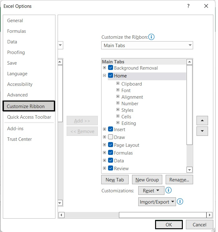 它將顯示一個彈出視窗,並在設定頁面的左側自動為您選擇“自定義功能區”。