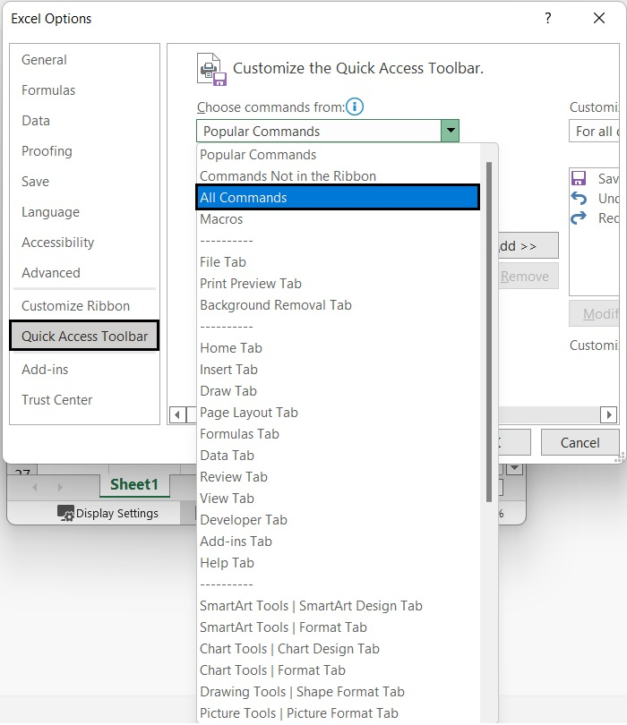 之後,選擇“快速訪問工具欄”,然後將“從以下位置選擇命令”選項修改為“所有命令”。