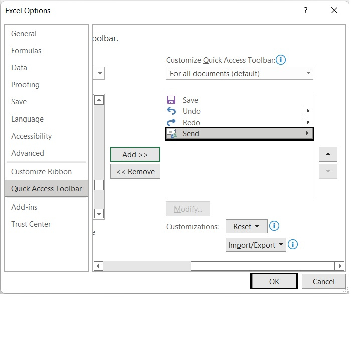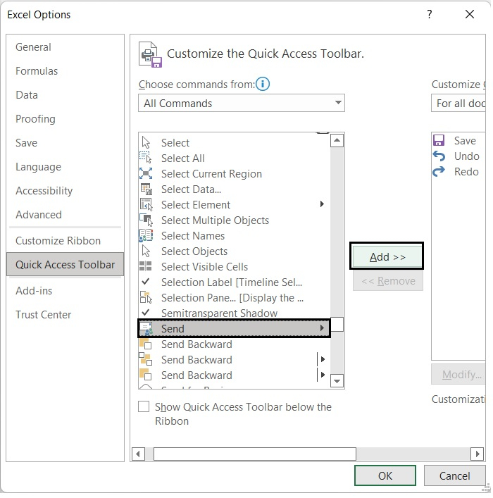 需要向Excel的“快速訪問工具欄”新增一個圖示,以便更容易訪問。這將允許傳送Excel工作表或工作表一部分作為電子郵件附件的功能。