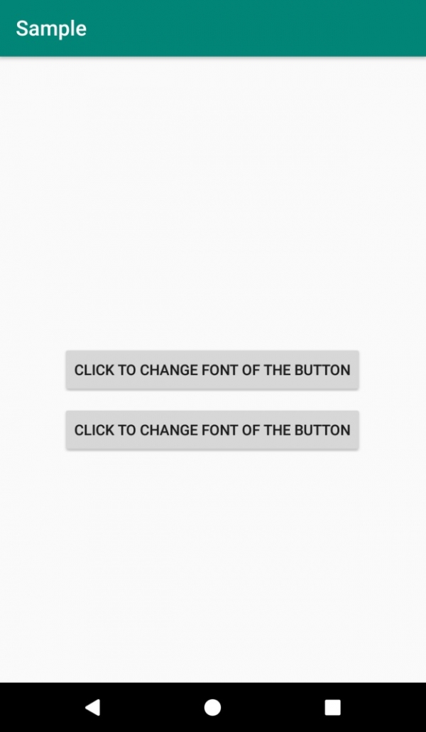 <RelativeLayout xmlns:android="http://schemas.android.com/apk/res/android" xmlns:tools="http://schemas.android.com/tools" android:id="@+id/rl" android:layout_width="match_parent" android:layout_height="match_parent" android:padding="10dp" tools:context=".MainActivity"> <Button android:id="@+id/btnChangeFont" android:layout_width="wrap_content" android:layout_height="wrap_content" android:layout_centerInParent="true" android:text="Click to change font of the Button" /> <Button android:id="@+id/btnChangeFont2" android:layout_width="wrap_content" android:layout_height="wrap_content" android:layout_centerInParent="true" android:layout_below="@id/btnChangeFont" android:layout_marginTop="10dp" android:text="Click to change font of the Button" /> </RelativeLayout>