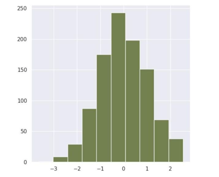 import matplotlib.pyplot as plt import numpy as np import seaborn as sns sns.set(style='darkgrid') # To generate the random data by using a random method data = np.random.randn(1000) # Set the size of the histogram plt.figure(figsize=(6,6)) # Plot plt.hist(data, bins=10, color='#738050') plt.show()
