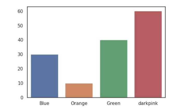 import seaborn as sns import matplotlib.pyplot as plt # create data color = ['Blue', 'Orange', 'Green','darkpink'] color_percentage = [30, 10, 40, 60] # Create a figure and axes with the desired size fig, ax = plt.subplots(figsize=(6, 4)) # Plot the data sns.barplot(x=color, y=color_percentage, ax=ax) plt.show()