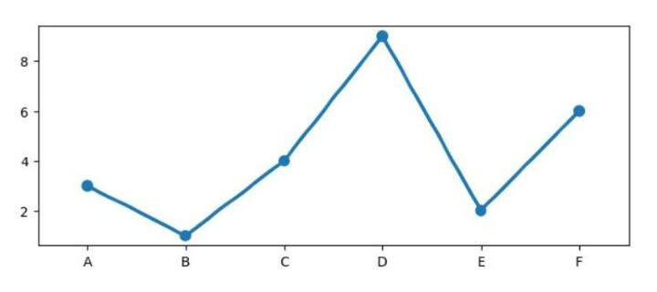 import seaborn as sns import matplotlib.pyplot as plt # Data x_ax = ['A', 'B', 'C', 'D', 'E', 'F'] y_ax = [3, 1, 4, 9, 2, 6] # Create a figure and axes with the desired size fig, ax = plt.subplots(figsize=(8, 3)) # Plot the data sns.pointplot(x=x_ax, y=y_ax, ax=ax) plt.show()