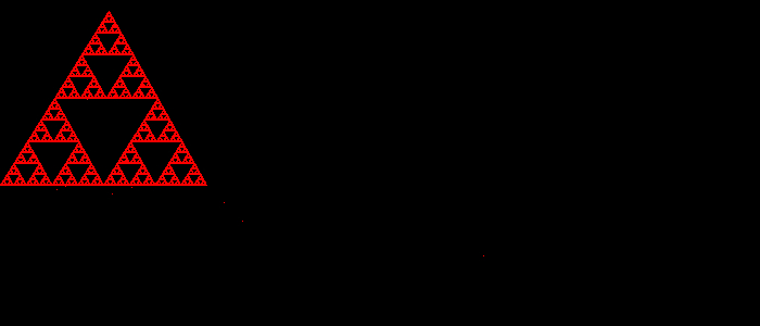 <?php $x = 700; $y = 300; $gd = imagecreatetruecolor($x, $y); $corners[0] = array('x' => 100, 'y' => 10); $corners[1] = array('x' => 0, 'y' => 170); $corners[2] = array('x' => 190, 'y' => 170); $blue = imagecolorallocate($gd, 255, 0, 0); for ($i = 0; $i < 100000; $i++) { imagesetpixel($gd, round($x),round($y), $blue); $a = rand(0, 2); $x = ($x + $corners[$a]['x']) / 2; $y = ($y + $corners[$a]['y']) / 2; } header('Content-Type: image/png'); imagepng($gd); ?>