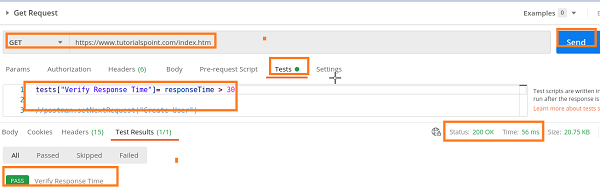 測試是一個數組型別的變數,可以儲存資料型別,如整數、字串、布林值等。驗證響應時間是測試名稱。響應時間獲取獲取響應所需的時間。