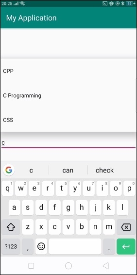 在上述結果中,我們只有一個建議,刪除 J 並在該文字檢視中鍵入 c,它將顯示多個建議,如下所示 -