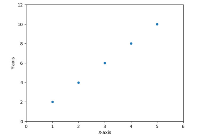 # Scatter plot import seaborn as sns import matplotlib.pyplot as plt # Generate some random data x = [1, 2, 3, 4, 5] y = [2, 4, 6, 8, 10] # Create a scatter plot sns.scatterplot(x=x, y=y) # Set labels and limits plt.xlabel('X-axis') plt.ylabel('Y-axis') plt.xlim(0, 6) plt.ylim(0, 12) # Show the plot plt.show()