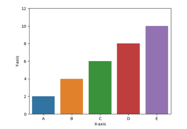 # Bar plot import seaborn as sns import matplotlib.pyplot as plt # Generate some random data x = ['A', 'B', 'C', 'D', 'E'] y = [2, 4, 6, 8, 10] # Create a bar plot sns.barplot(x=x, y=y) # Set labels and limits plt.xlabel('X-axis') plt.ylabel('Y-axis') plt.ylim(0, 12) # Show the plot plt.show()