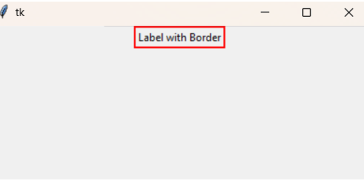 import tkinter as tk root = tk.Tk() label = tk.Label(root, text="Label with Border") label.config(highlightbackground="red", highlightthickness=2) label.pack() root.mainloop()