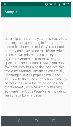 <? xml version= "1.0" encoding= "utf-8" ?> <RelativeLayout xmlns: android = "http://schemas.android.com/apk/res/android" xmlns: tools = "http://schemas.android.com/tools" android :layout_width= "match_parent" android :layout_height= "match_parent" android :layout_margin= "16dp" tools :context= ".MainActivity" > <TextView android :layout_width= "match_parent" android :layout_height= "wrap_content" android :layout_centerInParent= "true" android :text= "@string/lorem" android :textSize= "18sp" /> </RelativeLayout>