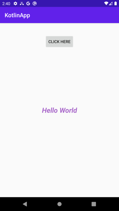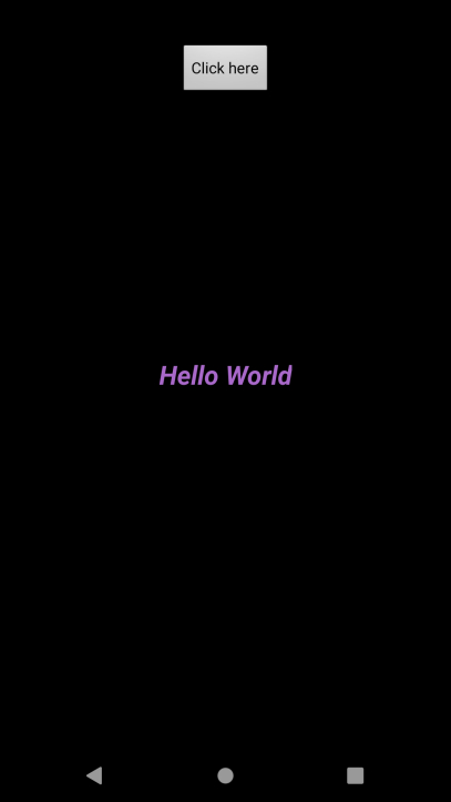 <?xml version="1.0" encoding="utf-8"?> <RelativeLayout xmlns:android="http://schemas.android.com/apk/res/android" xmlns:tools="http://schemas.android.com/tools" android:layout_width="match_parent" android:layout_height="match_parent" tools:context=".MainActivity"> <Button android:layout_width="wrap_content" android:layout_height="wrap_content" android:layout_centerHorizontal="true" android:layout_marginTop="40dp" android:onClick="clickHere" android:text="Click here" /> <TextView android:textSize="24sp" android:textStyle="bold|italic" android:textColor="@android:color/holo_purple" android:layout_width="wrap_content" android:layout_height="wrap_content" android:layout_centerInParent="true" android:text="Hello World" /> </RelativeLayout>