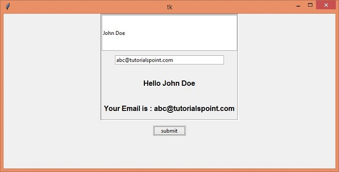 Label(frame, text= "Your Email is : "+ entry2.get(), font=('Helvetica',12, 'bold')).pack(pady=12)