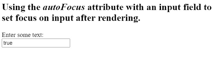 import React, { useState } from "react"; export default function App() { const [foucsText, setFocusText] = useState(true); function handleInput(event) { let value = event.target.value; setFocusText(value); } return ( <div className = "App"> <h2> {" "} Using the <i> autoFocus </i> attribute with an input field to set focus on input after rendering. {" "} </h2> <label for = "name"> Enter some text: </label> <br></br> <input id = "name" autoFocus onInput = {handleInput} value = {foucsText} /> </div> ); }