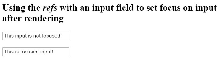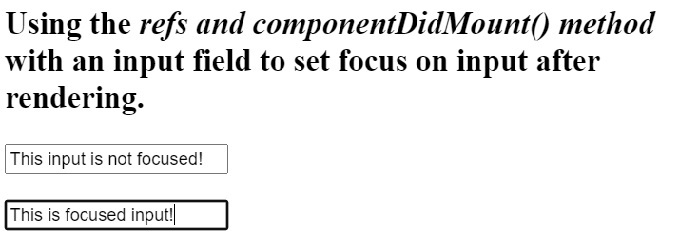 import React from "react"; class App extends React.Component { componentDidMount() { this.secondInput.focus(); } render() { return ( <div> <h2> {" "} Using the <i> refs and componentDidMount() method </i> with an input field to set focus on input after rendering.{" "} </h2> <input defaultValue = "This input is not focused!" ref = {(firstInp) => { this.firstInput = firstInp; }} /> <br></br> <br></br> <input ref = {(secondInput) => { this.secondInput = secondInput; }} defaultValue = "This is focused input!" /> </div> ); } } export default App;