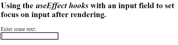 import React, { useState, useRef, useEffect } from "react"; export default function App() { const testRef = useRef(); useEffect(() => { testRef.current.focus(); }, []); const [foucsText, setFocusText] = useState(""); function handleInput(event) { let value = event.target.value; setFocusText(value); } return ( <div className = "App"> <h2> {" "} Using the <i> useEffect hooks </i> with an input field to set focus on input after rendering.{" "} </h2> <label for = "name">Enter some text: </label> <br></br> <input id = "name" ref = {testRef} onInput = {handleInput} value = {foucsText} /> </div> ); }