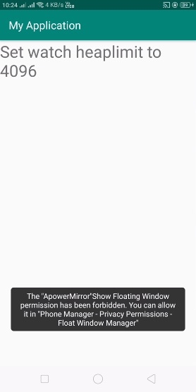 package com.example.myapplication; import android.app.ActivityManager; import android.app.admin.DevicePolicyManager; import android.content.Context; import android.net.wifi.WifiInfo; import android.net.wifi.WifiManager; import android.os.Build; import android.os.Bundle; import android.support.annotation.RequiresApi; import android.support.v7.app.AppCompatActivity; import android.view.View; import android.widget.TextView; public class MainActivity extends AppCompatActivity { TextView textView; DevicePolicyManager deviceManger; ActivityManager activityManager; @RequiresApi(api = Build.VERSION_CODES.N) @Override protected void onCreate(Bundle savedInstanceState) { super.onCreate(savedInstanceState); setContentView(R.layout.activity_main); textView = findViewById(R.id.text); deviceManger = (DevicePolicyManager)getSystemService(Context.DEVICE_POLICY_SERVICE); activityManager = (ActivityManager)getSystemService(Context.ACTIVITY_SERVICE); activityManager.setWatchHeapLimit(4096); textView.setText("Set watch heaplimit to 4096"); } }