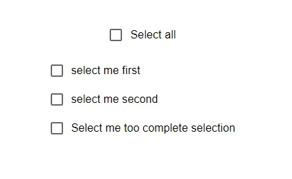 import { FormControlLabel } from "@mui/material"; import Checkbox from "@mui/material/Checkbox"; import React from "react"; import { useState } from "react"; export default function App() { const [inpChecked, setInpChecked] = useState([true, false, false]); const handleChkInpOne = (e) => { setInpChecked([e.target.checked, inpChecked[1], inpChecked[2]]); }; const handleChkInpTwo = (e) => { setInpChecked([inpChecked[0], e.target.checked, inpChecked[2]]); }; const handleChkInpThree = (e) => { setInpChecked([inpChecked[0], inpChecked[1], e.target.checked]); }; const ChildInputs = ( <div style={{ display: 'flex', flexDirection: 'column' }}> <FormControlLabel label="select me first" control={<Checkbox checked={inpChecked[0]} onChange={handleChkInpOne} />} /> <FormControlLabel label="select me second" control={<Checkbox checked={inpChecked[1]} onChange={handleChkInpTwo} />} /> <FormControlLabel label="Select me too complete selection" control={<Checkbox checked={inpChecked[2]} onChange={handleChkInpThree} />} /> </div> ); const determineIndeterminate = () => { return inpChecked.some((item) => item) && !inpChecked.every((item) => item); }; return ( <div style={{ display: "flex", marginTop: 30, flexDirection: "column", alignItems: "center", justifyContent: "center", gap: 10, }}> <FormControlLabel label="Select all" control={ <Checkbox checked={inpChecked.every((i) => i)} indeterminate={determineIndeterminate()} onChange={(e) => setInpChecked([e.target.inpChecked, e.target.inpChecked, e.target.inpChecked])} /> } /> {ChildInputs} </div> ); }