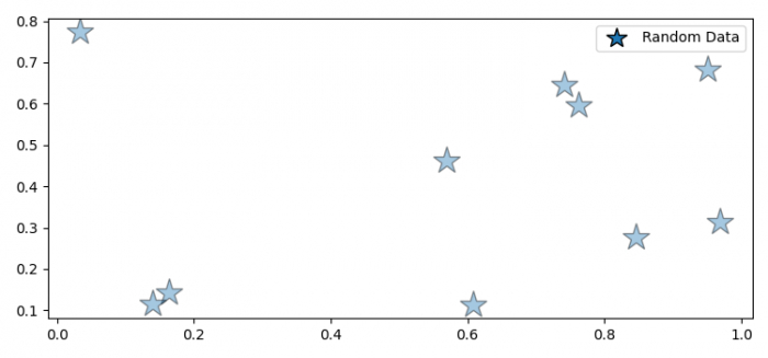 import matplotlib.pyplot as plt import numpy as np plt.rcParams["figure.figsize"] = [7.50, 3.50] plt.rcParams["figure.autolayout"] = True N = 10 x = np.random.rand(N) y = np.random.rand(N) line, = plt.plot(x, y, marker='*', markersize=20, markeredgecolor='black', alpha=0.4, ls='none', label='Random Data') legend = plt.legend(loc='upper right') legend.legendHandles[0]._legmarker.set_markersize(15) legend.legendHandles[0]._legmarker.set_alpha(1) plt.show()