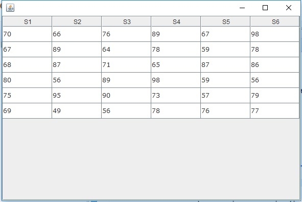 package my; import java.awt.Font; import javax.swing.JFrame; import javax.swing.JScrollPane; import javax.swing.JTable; public class SwingDemo { public static void main(String[] argv) throws Exception { Integer[][] marks = { { 70, 66, 76, 89, 67, 98 }, { 67, 89, 64, 78, 59, 78 }, { 68, 87, 71, 65, 87, 86 }, { 80, 56, 89, 98, 59, 56 }, { 75, 95, 90, 73, 57, 79 }, { 69, 49, 56, 78, 76, 77 } }; String students[] = { "S1", "S2", "S3", "S4", "S5", "S6"}; JTable table = new JTable(marks, students); Font font = new Font("Verdana", Font.PLAIN, 12); table.setFont(font); table.setRowHeight(30); JFrame frame = new JFrame(); frame.setSize(600, 400); frame.add(new JScrollPane(table)); frame.setVisible(true); } }