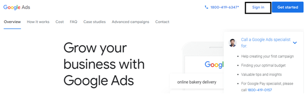 - 步驟 1 − 訪問 https://ads.google.com/ 網站(如下所示)。點選連結。
