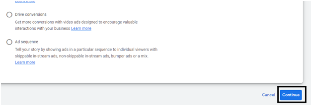 - 步驟 6 − 選擇自定義影片廣告系列後,點選繼續按鈕