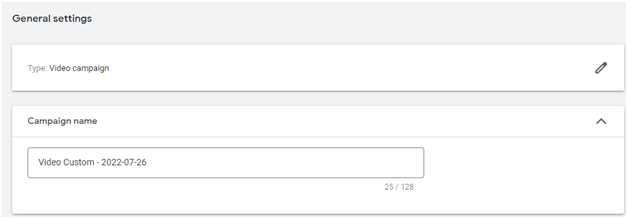 - 步驟 7 − 在常規設定頁面,您可以更改廣告系列名稱並編輯影片廣告系列設定。