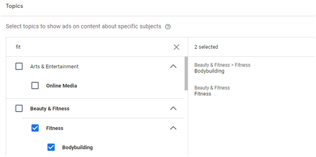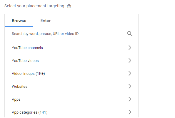 - 步驟 15 − 在主題部分正下方,您會找到展示位置部分。點選展示位置,將出現一個下拉選單(如下所示)。在展示位置定位中,您可以選擇希望您的廣告出現在哪些 YouTube 頻道或影片上。