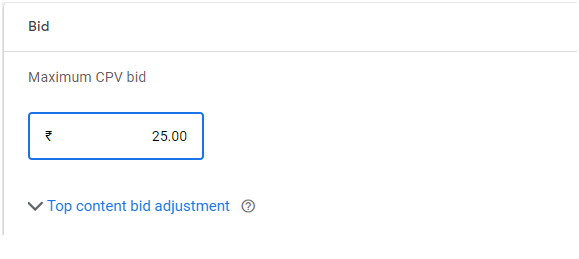 - 步驟 16 − 在同一個常規設定頁面,向下滾動,在展示位置部分正下方,您會找到出價部分。提供最高每次觀看費用 (CPV) 出價(如下所示)。