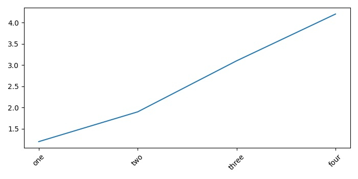 import matplotlib.pyplot as plt plt.rcParams["figure.figsize"] = [7.00, 3.50] plt.rcParams["figure.autolayout"] = True x = [1, 2, 3, 4] y = [1.2, 1.9, 3.1, 4.2] plt.plot(x,y) ax1 = plt.subplot() ax1.set_xticks(x) ax1.set_xticklabels(["one", "two", "three", "four"], rotation=45) plt.show()