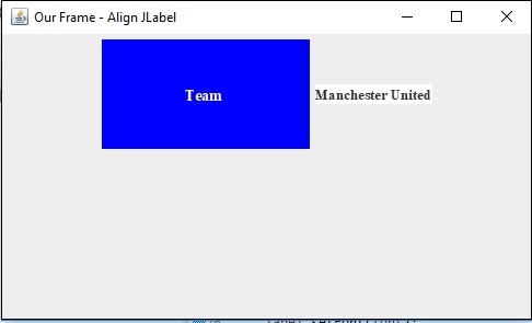 package my; import java.awt.Color; import java.awt.Dimension; import java.awt.FlowLayout; import java.awt.Font; import javax.swing.JFrame; import javax.swing.JLabel; import javax.swing.JTextArea; import javax.swing.WindowConstants; public class SwingDemo { public static void main(String[] args) { JFrame frame = new JFrame("Our Frame - Align JLabel"); frame.setLayout(new FlowLayout()); JLabel label = new JLabel("Team "); label.setPreferredSize(new Dimension(190, 100)); label.setOpaque(true); label.setBackground(Color.BLUE); label.setForeground(Color.WHITE); Font font = new Font("Serif", Font.BOLD, 14); label.setFont(font); label.setHorizontalAlignment(JLabel.CENTER); JTextArea text = new JTextArea(); text.setText("Manchester United"); font = new Font("Serif", Font.BOLD, 13); text.setFont(font); frame.add(label); frame.add(text); frame.setDefaultCloseOperation(WindowConstants.EXIT_ON_CLOSE); frame.setSize(500, 300); frame.setVisible(true); } }