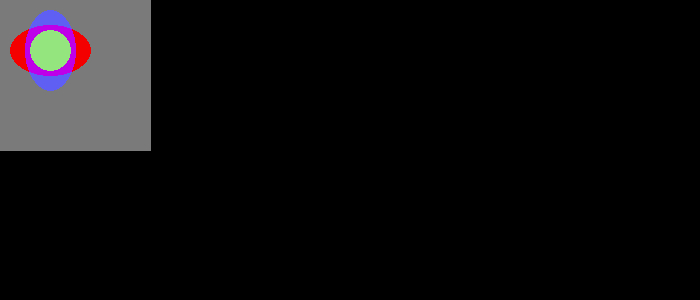 <?php // Setup an image using imagecreatetruecolor() function $img = imagecreatetruecolor(700, 300); // Set a background color imagefilledrectangle($img, 0, 0, 150, 150, imagecolorallocate($img, 122, 122, 122)); // Apply the overlay alpha blending flag imagelayereffect($img, IMG_EFFECT_OVERLAY); // Draw two grey ellipses imagefilledellipse($img, 50, 50, 40, 40, imagecolorallocate($img, 100, 255, 100)); imagefilledellipse($img, 50, 50, 50, 80, imagecolorallocate($img, 100, 100, 255)); imagefilledellipse($img, 50, 50, 80, 50, imagecolorallocate($img, 255, 0, 0)); // Output image header('Content-type: image/png'); imagepng($img); imagedestroy($img); ?>
