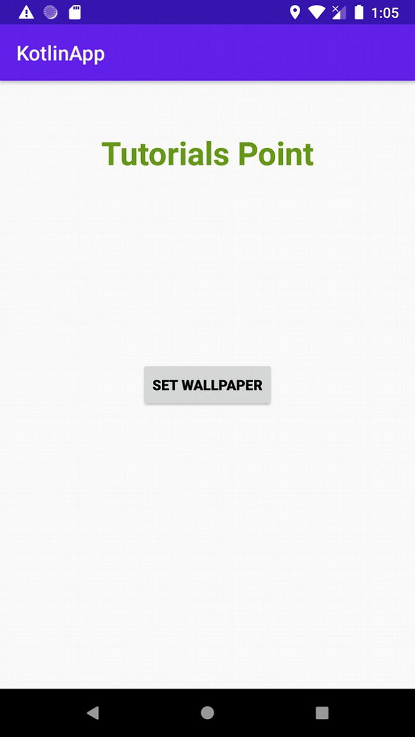 <?xml version="1.0" encoding="utf-8"?> <RelativeLayout xmlns:android="http://schemas.android.com/apk/res/android" xmlns:tools="http://schemas.android.com/tools" android:layout_width="match_parent" android:layout_height="match_parent" tools:context=".MainActivity"> <TextView android:id="@+id/textView" android:layout_width="wrap_content" android:layout_height="wrap_content" android:layout_centerHorizontal="true" android:layout_marginTop="50dp" android:padding="8dp" android:text="Tutorials Point" android:textColor="@color/colorPrimaryDark" android:textSize="48sp" android:textStyle="bold" /> <Button android:layout_width="wrap_content" android:layout_height="wrap_content" android:layout_centerInParent="true" android:onClick="setWallpaper" android:text="Set Wallpaper" android:textColor="@android:color/background_dark" android:textStyle="bold" /> </RelativeLayout>