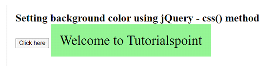 第一種方法是 CSS() 方法,該方法用於將 CSS 屬性設定為 HTML 元素。我們也可以使用此方法來設定元素的背景顏色。為此,我們可以將 CSS 屬性名稱和值作為引數傳遞。