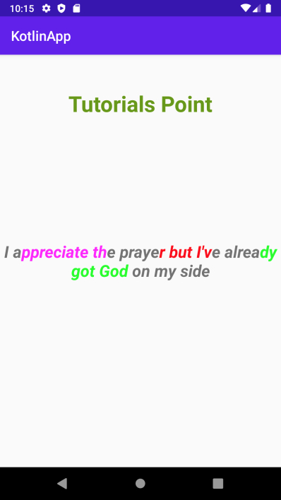 import android.graphics.Color import android.os.Bundle import android.text.SpannableString import android.text.Spanned import android.text.style.ForegroundColorSpan import android.widget.TextView import androidx.appcompat.app.AppCompatActivity class MainActivity : AppCompatActivity() { lateinit var textView:TextView override fun onCreate(savedInstanceState: Bundle?) { super.onCreate(savedInstanceState) setContentView(R.layout.activity_main) title = "KotlinApp" textView = findViewById(R.id.textView) val text = "I appreciate the prayer but I've already got God on my side" val spannableString = SpannableString(text) val foregroundColorSpanCyan = ForegroundColorSpan(Color.MAGENTA) val foregroundColorSpanBlue = ForegroundColorSpan(Color.RED) val foregroundColorSpanGreen = ForegroundColorSpan(Color.GREEN) spannableString.setSpan(foregroundColorSpanCyan, 3, 15, Spanned.SPAN_EXCLUSIVE_EXCLUSIVE) spannableString.setSpan(foregroundColorSpanBlue, 22, 31, Spanned.SPAN_EXCLUSIVE_EXCLUSIVE) spannableString.setSpan(foregroundColorSpanGreen, 38, 49, Spanned.SPAN_EXCLUSIVE_EXCLUSIVE) textView.text = spannableString } }