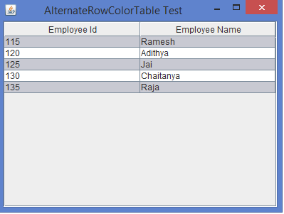 JTable table = new JTable(new Object[][] {{"115", "Ramesh"}, {"120", "Adithya"}, {"125", "Jai"}, {"130", "Chaitanya"}, {"135", "Raja"}}, new String[] {"Employee Id", "Employee Name"}) {