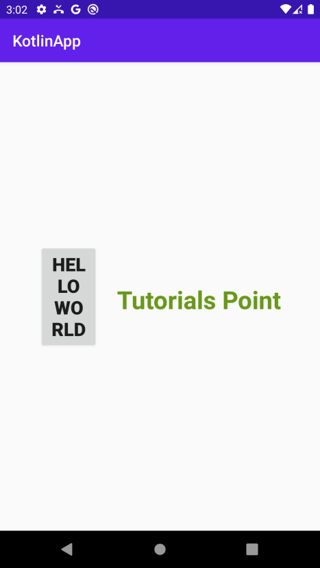 <?xml version="1.0" encoding="utf-8"?> <RelativeLayout xmlns:android="http://schemas.android.com/apk/res/android" xmlns:tools="http://schemas.android.com/tools" android:layout_width="match_parent" android:layout_height="match_parent" android:gravity="center" tools:context=".MainActivity"> <TextView android:layout_width="wrap_content" android:layout_height="wrap_content" android:layout_centerHorizontal="true" android:layout_marginTop="50dp" android:text="Tutorials Point" android:textAlignment="center" android:textColor="@android:color/holo_green_dark" android:textSize="32sp" android:textStyle="bold" /> <Button android:id="@+id/button" android:layout_width="wrap_content" android:layout_height="wrap_content" android:layout_centerInParent="true" android:onClick="expand" android:text="Hello World" android:textSize="24sp" android:textStyle="bold" /> </RelativeLayout>