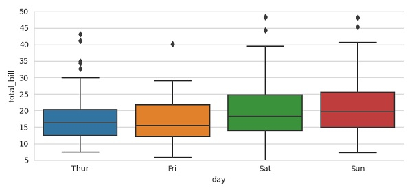 from matplotlib import pyplot as plt import seaborn as sns plt.rcParams["figure.figsize"] = [7.50, 3.50] plt.rcParams["figure.autolayout"] = True sns.set_style("whitegrid") tips = sns.load_dataset("tips") ax = sns.boxplot(x="day", y="total_bill", data=tips) plt.ylim(5, 50) plt.show()