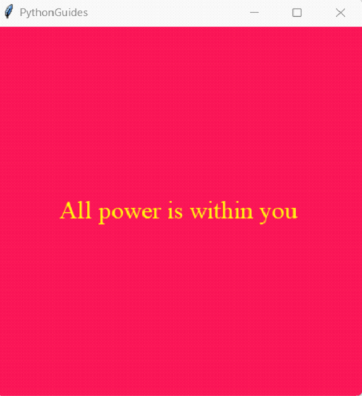 在以下示例中,使用 Tkinter 模組啟動程式,並在變數 tab 中使用內建函式 Tk() 設定主視窗。使用 title() 和 tab 變數,它設定了 GUI 介面的名稱。然後 geometry() 設定主視窗的大小,而 minsize() 設定視窗的最小大小,並且透過使用這些內建函式,它看起來更好。然後句子“所有力量都在你心中”顯示在“Times”字型大小為 20 的標籤中。標籤的背景顏色設定為 #f51655,文字顏色設定為 #fcfc0a。標籤使用 pack() 方法打包到視窗中,並使用 fill=BOTH 和 expand=True 引數。