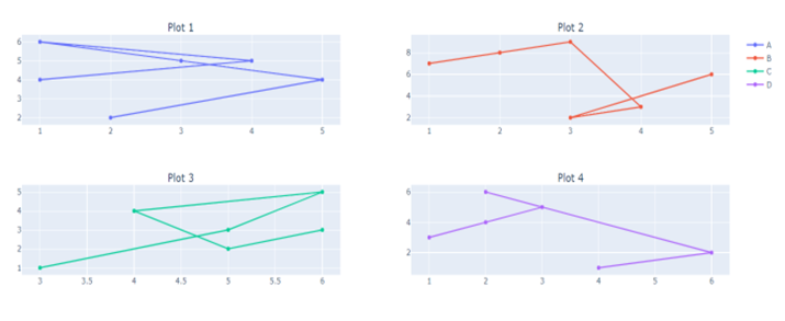 在以下示例中,我們將顯示四個不同子圖的圖形,這些子圖包含指向資料、subplot_title和分別在內建函式add_trace和update_layout中的圖例。這將幫助我們構建帶有圖例名稱的多個子圖。